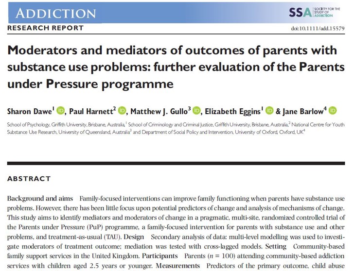 Background and aims Family-focused interventions can improve family functioning when parents have substance use problems. However, there has been little focus upon potential predictors of change and analysis of mechanisms of change. This study aims to identify mediators and moderators of change in a pragmatic, multi-site, randomized controlled trial ofthe Parents under Pressure (PuP) programme, a family-focused intervention for parents with substance use and other problems, and treatment-as-usual (TAU). Design Secondary analysis of data: multi-level modelling was used to investigate moderators of treatment outcome; mediation was tested with cross-lagged models. Setting Community-based family support services in the United Kingdom. Participants Parents (n = 100) attending community-based addiction services with children aged 2.5 years or younger. Measurements Predictors of the primary outcome, child abuse potential, were: baseline child age and gender, composite family risk score, parental substance use and parental emotional