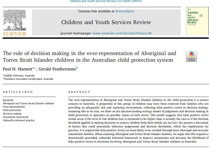 Assuming this to be true, we draw on the decision-making ecology model of judgement and decision making in child protection to speculate on possible causes of such errors. This model suggests that false positive errors would occur if the level of risk children face is estimated to be higher than is actually the case or if the decision threshold applied in making decisions to remove children from their family are too low. We present a discussion of factors that could potentially influence judgements and decision thresholds, which has implications for practice. It is argued that false positive errors are most likely to be avoided through more thorough and accurate assessments families. When assessing Aboriginal and Torres Strait Islander families, we argue that this requires a theoretically grounded, culturally informed framework to improve assessments and decrease the likelihood of false positive errors in decisions involving Aboriginal and Torres Strait Islander children in Australia.